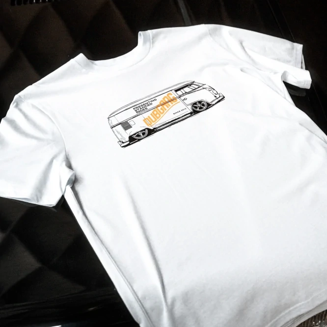 Ikonické unisex triko v čisté bílé barvě s detailním potiskem legendárního VW T1 na hrudi, doplněným výrazným žlutým logem DUBGANG. Design inspirovaný klasickou automobilovou kulturou a svobodou cestování.