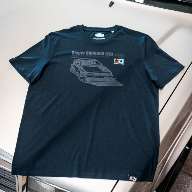 Unisex triko v hluboké french navy barvě s velkým předním motivem Rieger Corrado. Výrazný potisk v kombinaci červené, modré a tmavě modré barvy dává triku silný automotive charakter inspirovaný upravenými vozy a evropskou tuningovou kulturou.