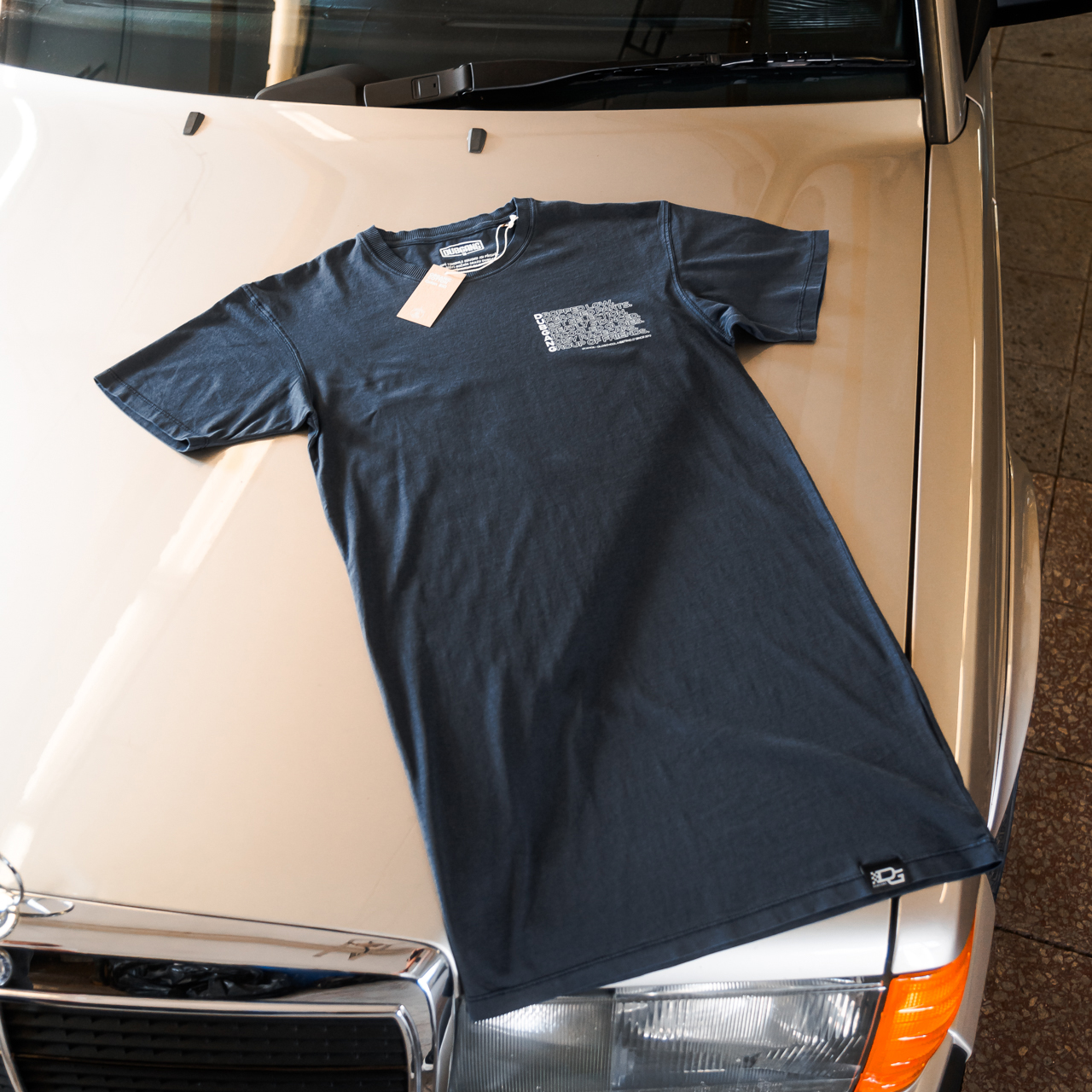 Bílé logo DUBGANG umístěné uprostřed hrudi vytváří výrazný, ale stále minimalistický kontrast.